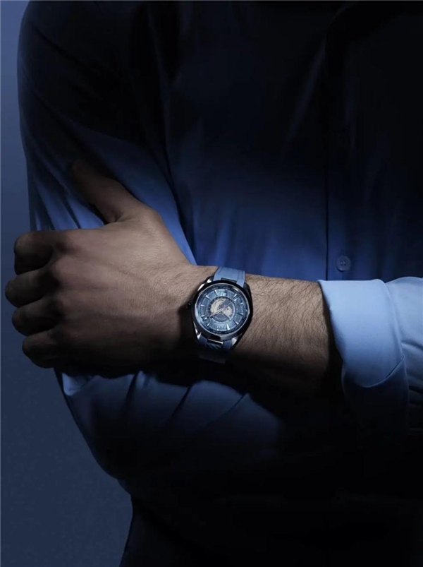 表帶有兩種材質(zhì)可供選擇:精鋼或與表盤同色系的橡膠。藍色橡膠表帶有著細膩的編織紋,不會因為是橡膠材質(zhì)就敷衍了事,擅做料理的人會說,這紋理仿佛精致的十字花刀,不難搭配、也不太挑人。這表帶像是一件得體的淺藍襯衫,正裝休閑兩相宜。腕表防水深度150米,不論是揚帆出;蚴嵌俗趯懽謽抢,都游刃有余。