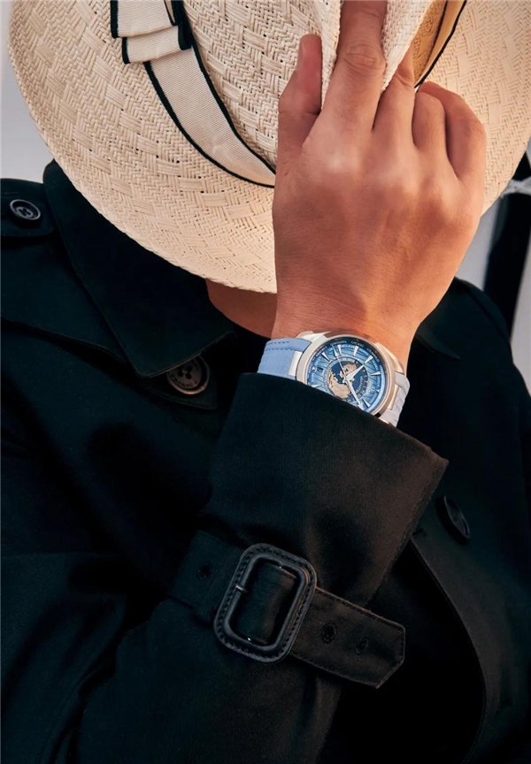 精鋼材質(zhì)表殼,直徑43mm,采用激光燒蝕技術雕刻出地形的紋理和質(zhì)感,并用激光技術進行著色處理,最終呈現(xiàn)出精致的藍色海洋和各大洲的浮雕地形圖。防水深度150米。腕表搭載8938至臻天文臺機芯。