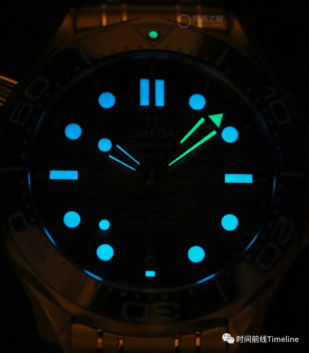 手表時標(biāo)以及指針夜光涂層,顏色和表圈上的琺瑯接近。加上海馬300米陶瓷盤面上激光雕刻的波浪花紋,足實(shí)的用料,相對復(fù)雜的表頭裝飾,讓歐米茄展現(xiàn)了超出同級別、同價位的豪華感。