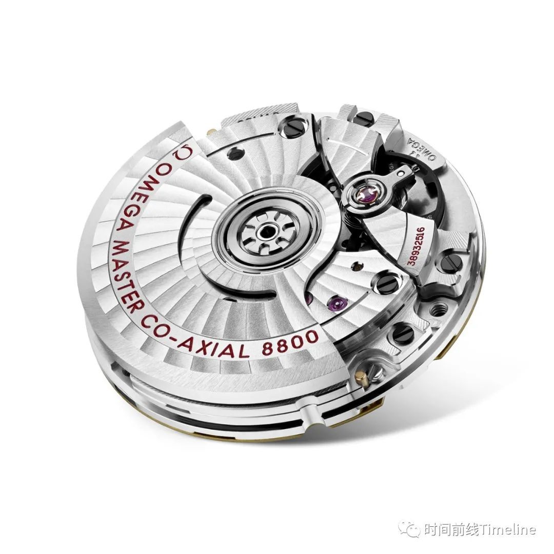 8800機(jī)芯的發(fā)條盒也有DLC鍍層,鈦金屬擺輪也做了鍍黑。使用硅游絲,無卡度砝碼微調(diào),機(jī)芯上層夾板是歐米茄獨(dú)有的“阿拉伯風(fēng)格日內(nèi)瓦條紋”裝飾。