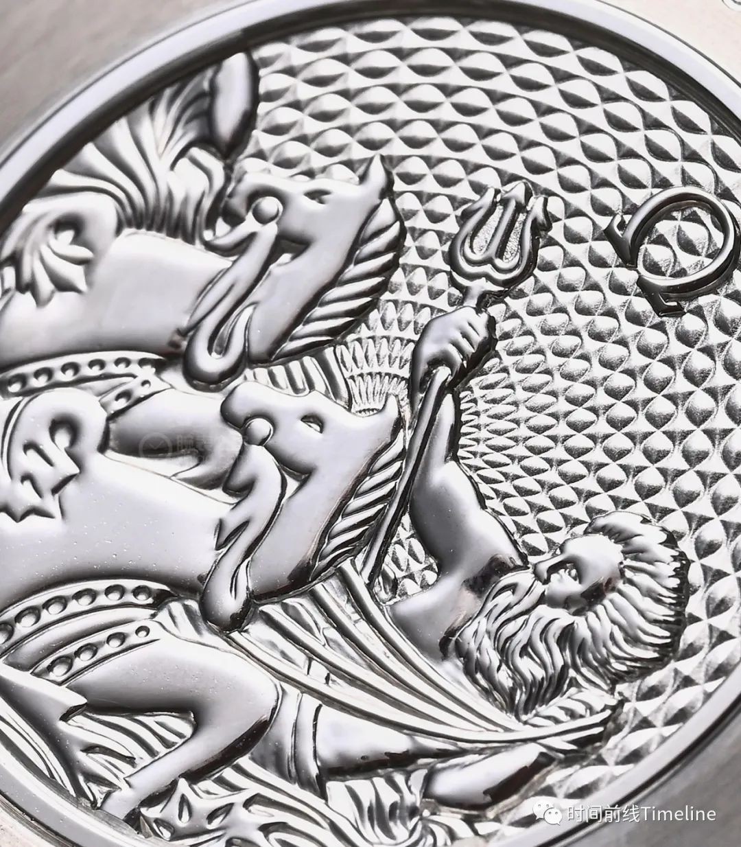手表底蓋,雕刻了海神波塞冬手持三叉戟,駕馭海馬的圖案。并從盤面中央,向四周發(fā)散扭索紋裝飾。