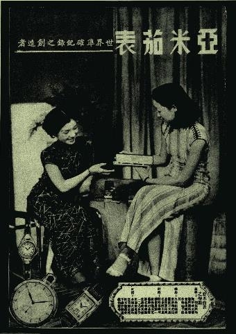 海報(bào)中的廣告正是女士手表,模特身穿旗袍,風(fēng)情萬種,大方地欣賞著這塊精美的手表,也讓我們能從其中窺見當(dāng)時(shí)上海的繁榮景象。