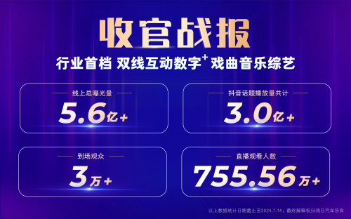 本次獲獎的《鴻日小鎮(zhèn)戲曲音樂節(jié)》,是由鴻日汽車攜手山東廣播電視臺生活頻道、河南廣播電視臺都市頻道、河北廣播電視臺農(nóng)民頻道、遼寧廣播電視臺北方頻道共同打造的行業(yè)首檔雙線互動數(shù)字+戲曲音樂綜藝,從2024年5月25日到7月14日,51天共舉辦10場主題為“村村有好戲,家家有鴻日”的《鴻日小鎮(zhèn)戲曲音樂節(jié)》、100 +場“城·鎮(zhèn)”區(qū)域好品好戲購車惠和1000 +場“村·鎮(zhèn)”戲曲音樂巡演。