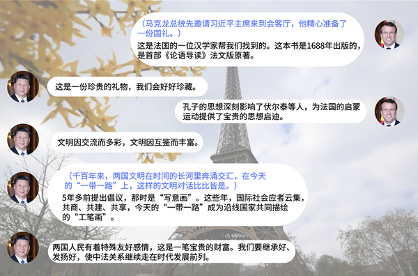 “文明因交流而多彩,文明因互鑒而豐富!绷(xí)近平主席上一次到訪法國是在5年前,他的演講闡釋了對文明互鑒的思考。千百年來,兩國文明在時間的長河里奔涌交匯,在今天的“一帶一路”上,這樣的文明對話比比皆是。古絲綢之路的復(fù)興,也是文明的復(fù)興。習(xí)近平主席說,5年多前提出倡議,那時是“寫意畫”。這些年,國際社會應(yīng)者云集,共商、共建、共享,今天的“一帶一路”成為沿線國家共同描繪的“工筆畫”。