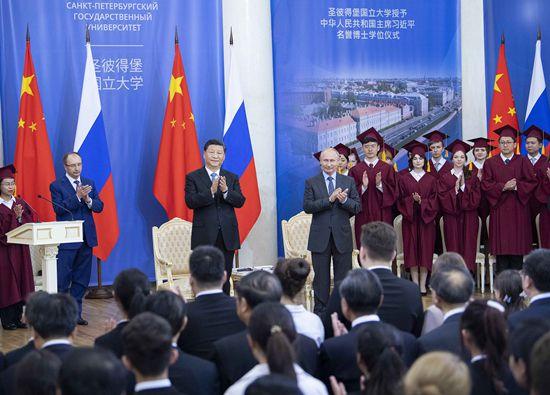 當?shù)貢r間6月6日,又一場特殊儀式在圣彼得堡國立大學舉行。習近平被授予圣彼得堡國立大學名譽博士學位。他在答辭中說道,這既是雙方教育和人文領(lǐng)域密切交流的例證,更是中俄關(guān)系高水平的重要體現(xiàn)。他同時希望雙方不斷擴大教育領(lǐng)域交流合作。
