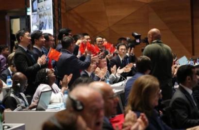 中國代表團(tuán)全體起立鼓掌,揮舞國旗相互祝賀,臉上洋溢著自豪和喜悅的笑容。多國代表也紛紛上前,送上誠摯的祝賀。