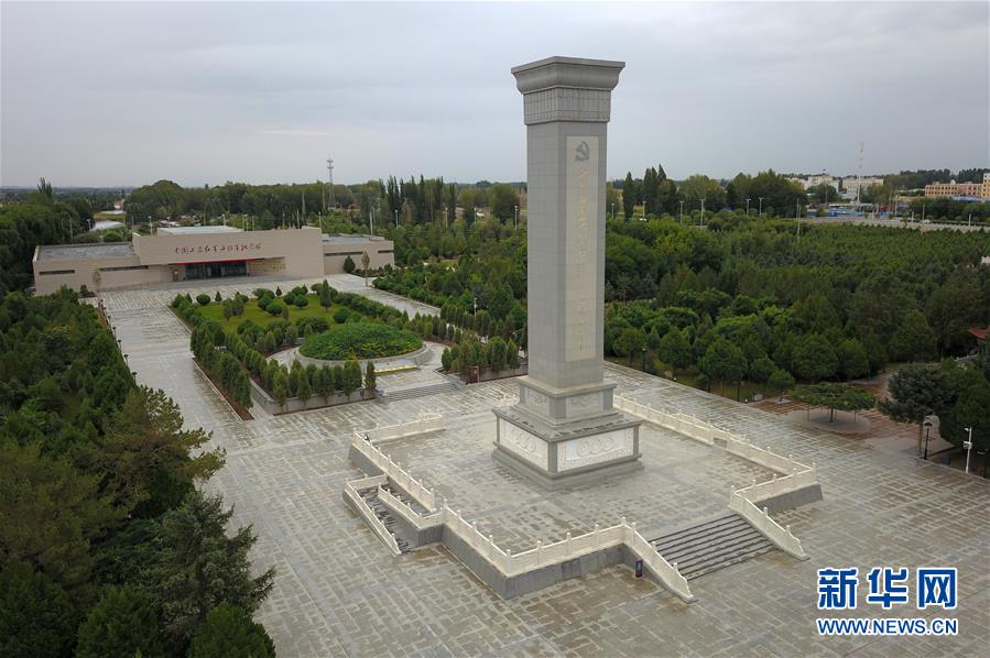 這是在張掖市高臺縣拍攝的中國工農(nóng)紅軍西路軍紀(jì)念碑和陣亡烈士公墓(8月21日無人機拍攝)。 新華社記者 范培珅 攝