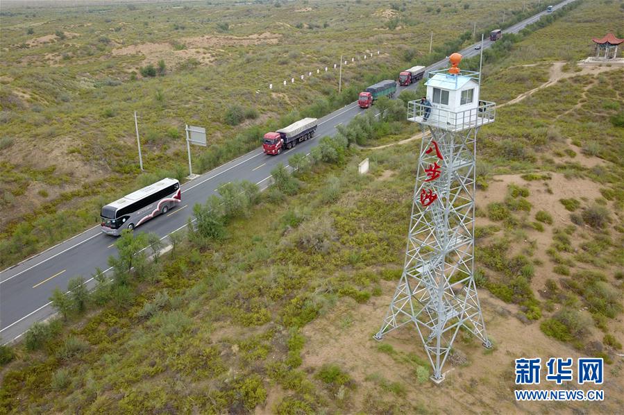 在武威市古浪縣八步沙林場,場長郭萬剛(左一)和大家一起前往治沙點(8月23日無人機拍攝)。新華社記者 范培珅 攝