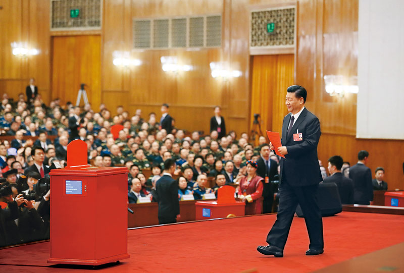 2018年3月17日,十三屆全國人大一次會(huì)議在北京人民大會(huì)堂舉行第五次全體會(huì)議。習(xí)近平當(dāng)選中華人民共和國主席、中華人民共和國中央軍事委員會(huì)主席。這是習(xí)近平準(zhǔn)備投票。 新華社記者 蘭紅光/攝