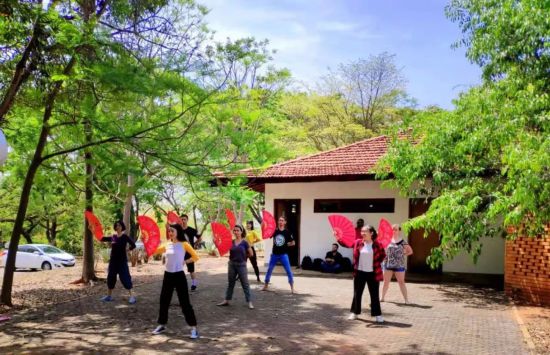 ▲巴西學生在巴西利亞大學孔子學院體驗中國扇子舞。(巴西利亞大學孔子學院供圖)