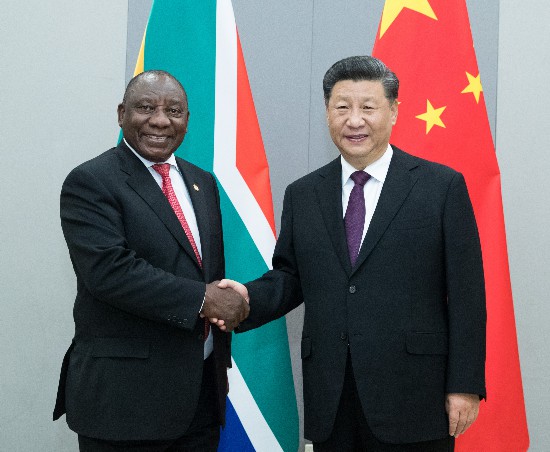 ▲當?shù)貢r間11月14日,國家主席習近平在巴西利亞會見南非總統(tǒng)拉馬福薩。新華社記者王曄攝