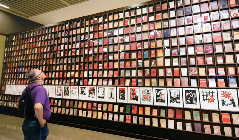 2018年5月9日,一位外國(guó)觀眾被北京“真理的力量——紀(jì)念馬克思誕辰200周年主題展覽”中一面展示不同國(guó)家出版的500多種《共產(chǎn)黨宣言》的書墻所吸引。 中新社記者 賈天勇/攝