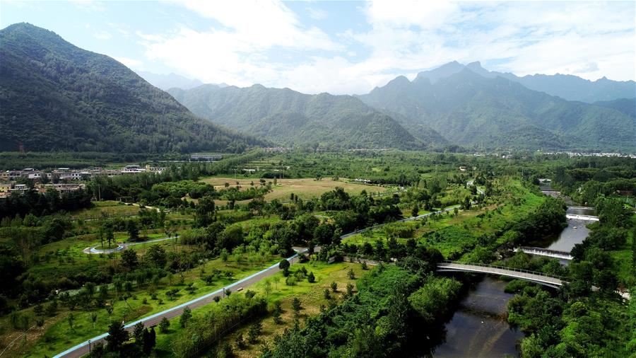 陜西省西安市長(zhǎng)安區(qū)秦嶺違建別墅“群賢別業(yè)”拆除后建設(shè)的秦嶺和諧森林公園(2019年7月26日無(wú)人機(jī)照片)。新華社記者 劉瀟 攝