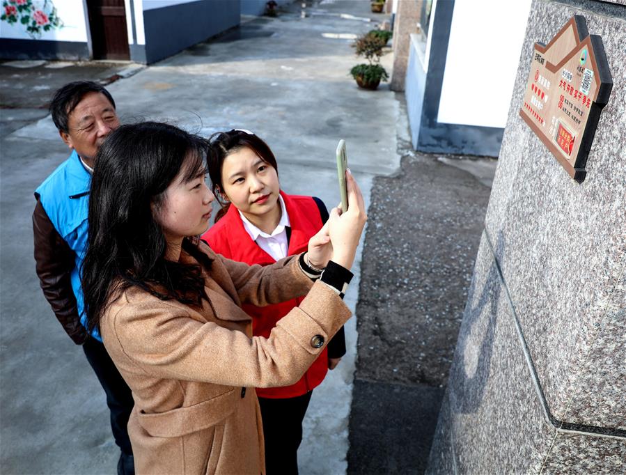 浙江省長(zhǎng)興縣李家巷鎮(zhèn)劉家渡村村民(前)在黨員志愿者的指導(dǎo)下,用手機(jī)掃描二維碼(“村務(wù)e點(diǎn)通”),查看最新的文明誠(chéng)信檔案考評(píng)結(jié)果(2019年11月28日攝)。 新華社記者 徐昱 攝