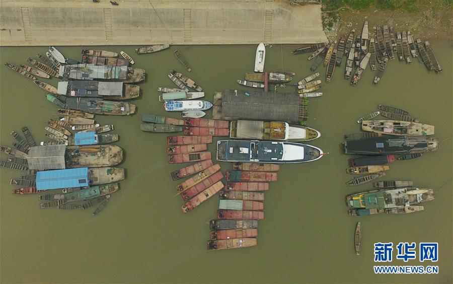 在湖南常德漢壽縣蔣家嘴鎮(zhèn),待回收的鐵漁船停靠在洞庭湖邊(2019年12月17日攝,無人機(jī)照片)。新華社記者 薛宇舸 攝