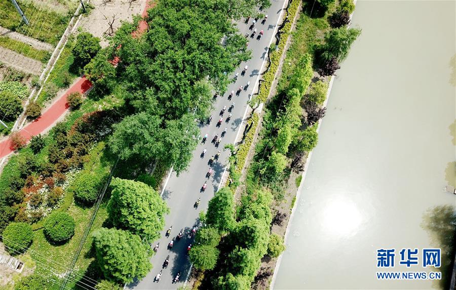 參加2019年環(huán)崇明島國際自盟女子公路世界巡回賽的運(yùn)動(dòng)員在三星鎮(zhèn)海棠花溪景區(qū)內(nèi)騎行(2019年5月9日攝,無人機(jī)照片)。新華社記者 方喆 攝