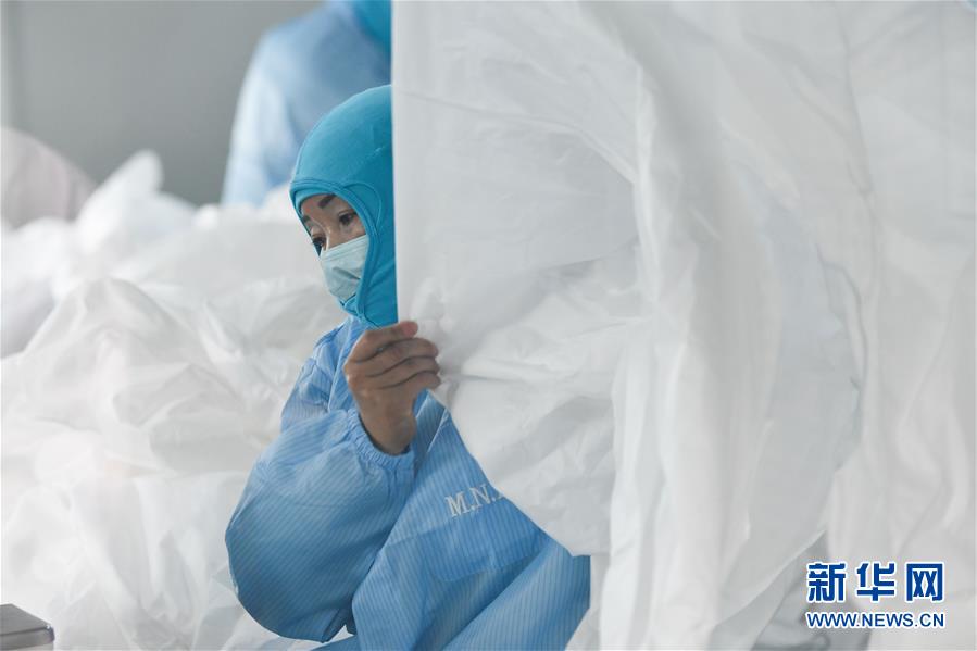 2月5日,在安徽莫尼克醫(yī)用材料有限公司,工作人員在趕制防護(hù)服。新華社記者張端攝