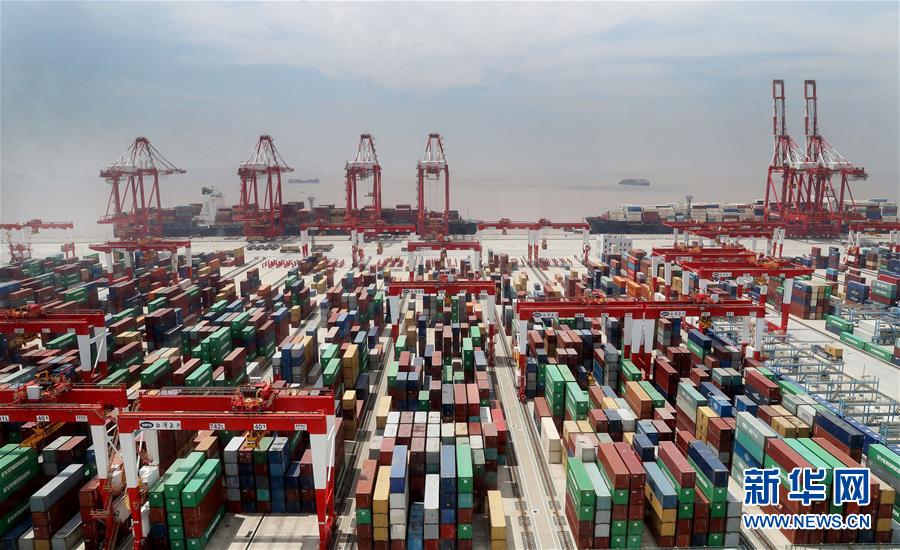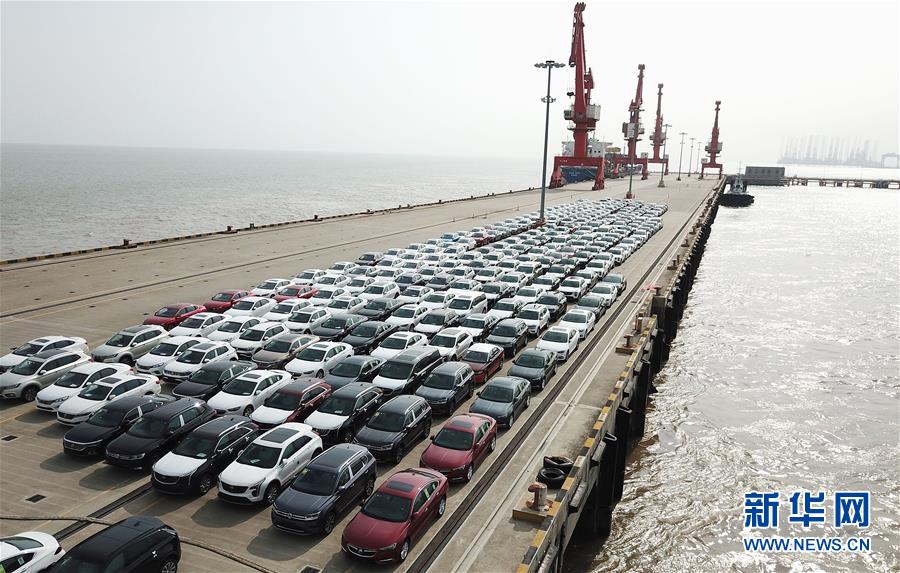在位于上海臨港的上海南港碼頭,新出廠的汽車等待裝船轉運(2019年6月27日攝,無人機照片)。新華社記者 方喆攝