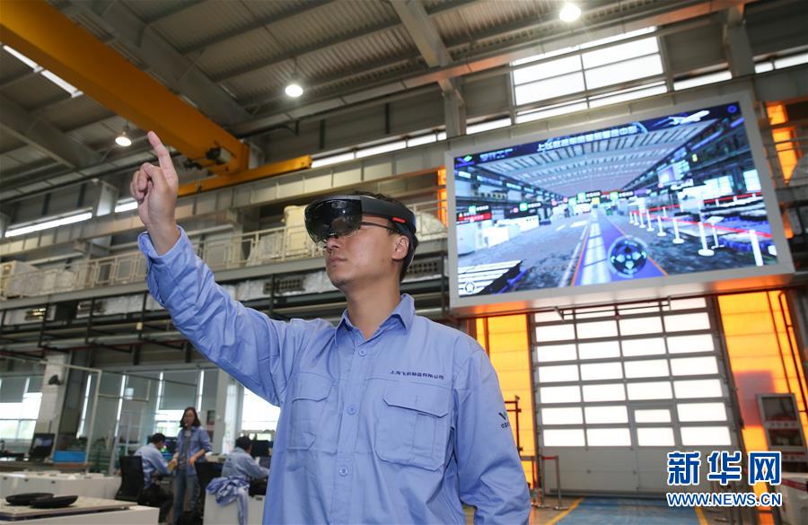 工作人員在中國商飛公司總裝制造中心智慧數(shù)控車間使用AR眼鏡操控虛擬電子屏幕(2018年5月5日攝)。新華社記者 丁汀攝