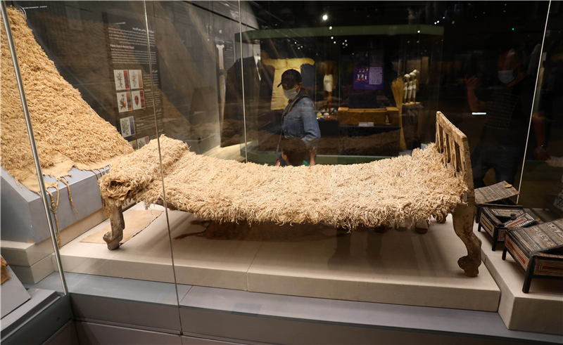 4月19日,游客在位于埃及首都開羅的埃及文明博物館紡織品館參觀古代床上織物用品。