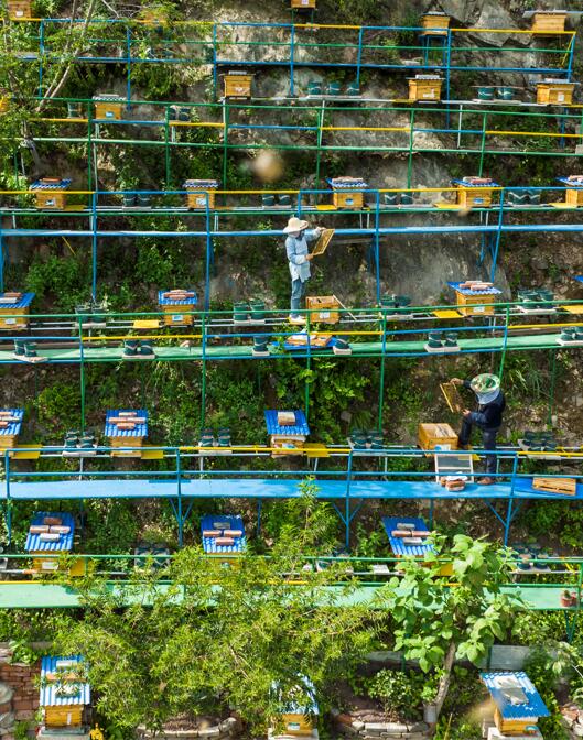 4月18日,秭歸縣歸州鎮(zhèn)周家灣村養(yǎng)蜂人在檢查蜂箱(無人機(jī)拍攝)。 新華社發(fā)(鄭家裕攝)