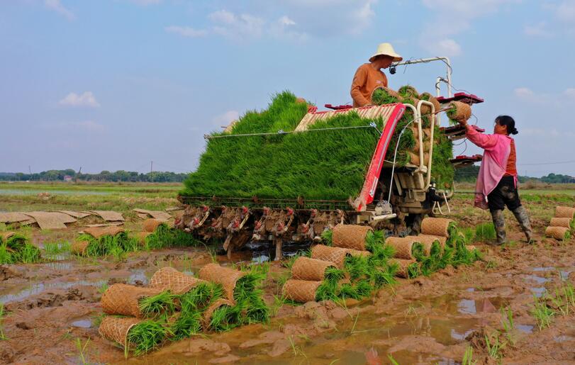 4月12日,在江西省吉安市泰和縣沿溪鎮(zhèn)倉嶺村,農(nóng)民在給插秧機裝載秧苗。  新華社發(fā)(鄧和平攝)