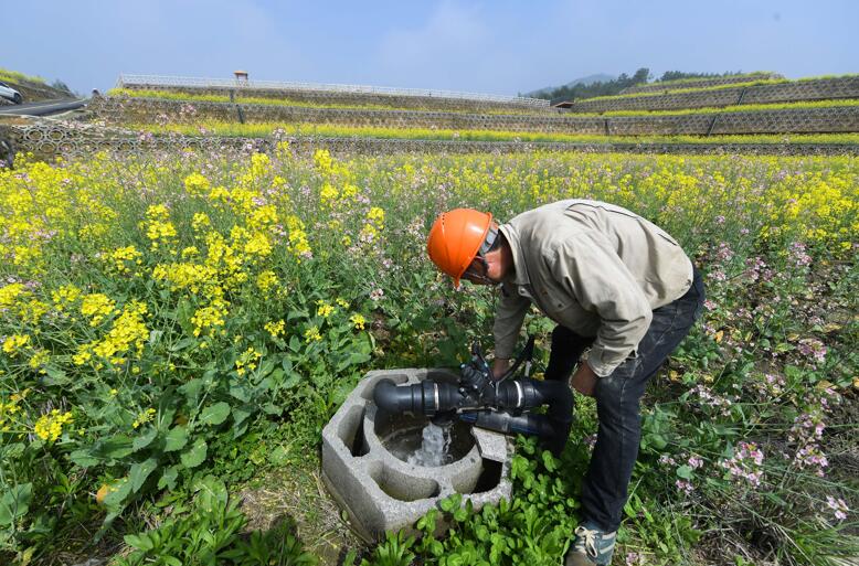 3月29日,在杭州市富陽區(qū)新登街道潘堰村的“海綿農(nóng)田”內(nèi),工作人員查看農(nóng)田下的地下隱形水庫水泵運(yùn)行情況。