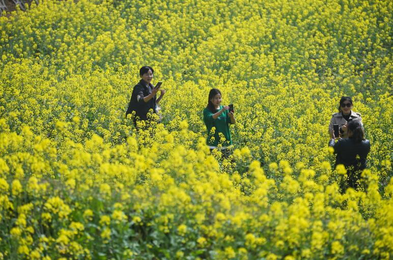 3月29日,游客在杭州市富陽區(qū)新登街道潘堰村“海綿農(nóng)田”的油菜花地里拍照留影。 新華社記者徐昱攝