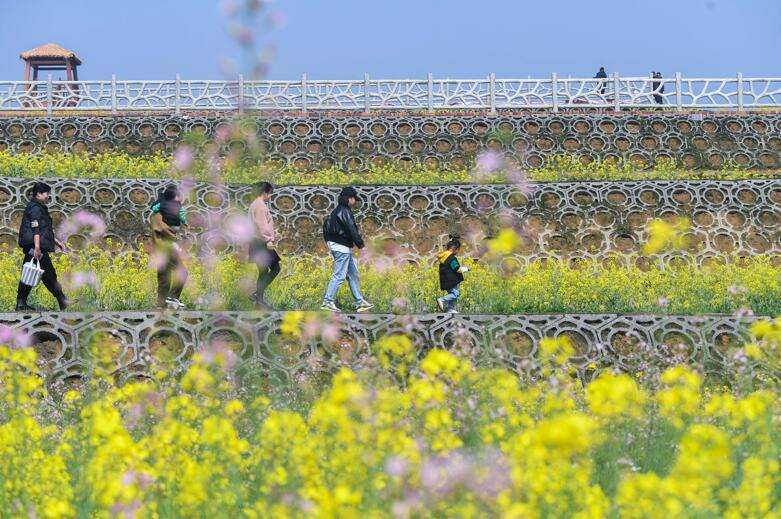 3月29日,游客行走在杭州市富陽區(qū)新登街道潘堰村“海綿農(nóng)田”的觀光道上。 新華社記者徐昱攝