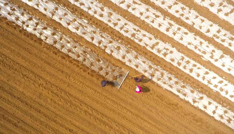 3月23日,山東省聊城市茌平區(qū)賈寨鎮(zhèn)前付村村民在田間給種植的花生覆蓋地膜(無人機照片)。 新華社發(fā)(趙玉國攝)