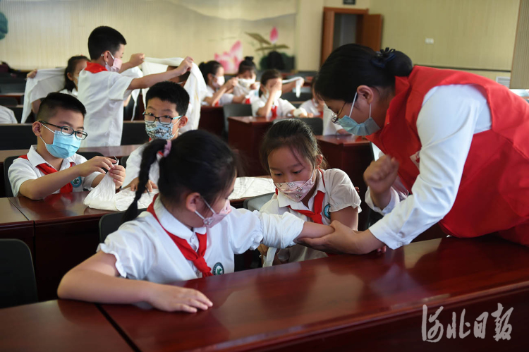 2022年6月20日,河北省石家莊市維明路小學學生在醫(yī)護人員指導下學習手臂外傷包扎急救知識。河北日報記者趙永輝攝