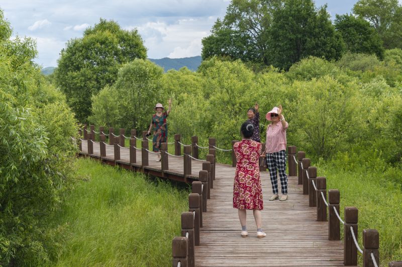 6月19日,游客在烏蘇里江國家濕地公園內(nèi)游玩拍照。