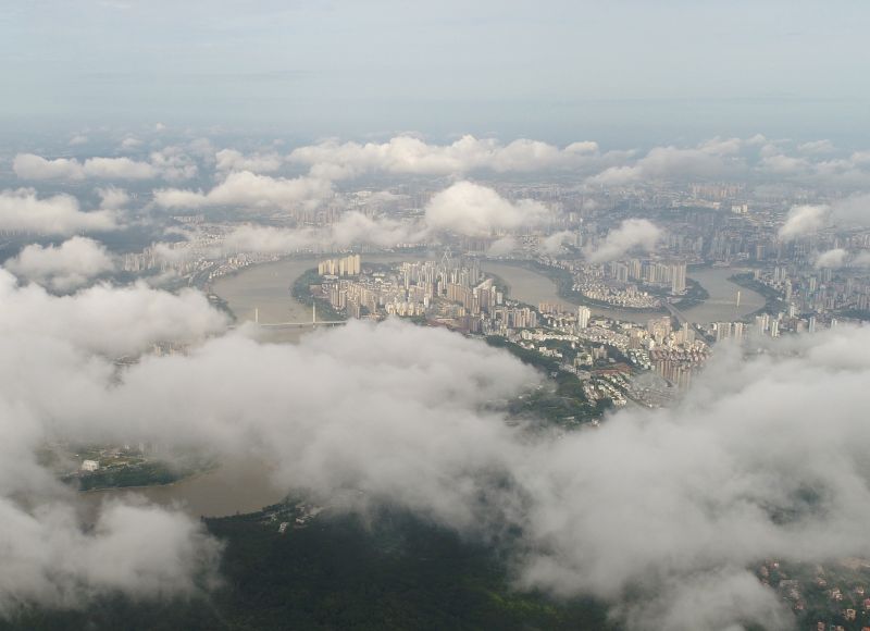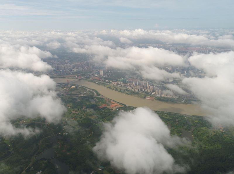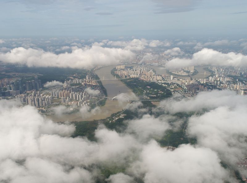 6月19日,廣西南寧市降雨稍歇,低空飄著的朵朵白云與穿城而過的邕江構(gòu)成一幅美麗畫卷(無人機照片)。新華社記者 周華 攝