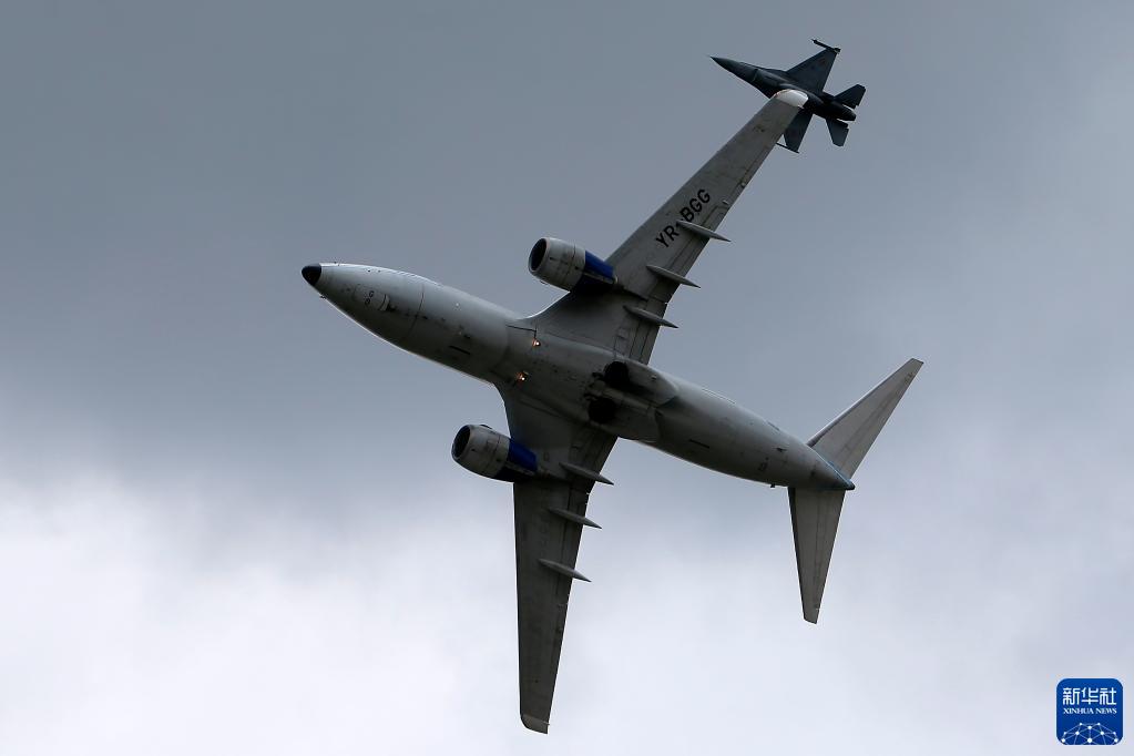 9月4日,在羅馬尼亞布加勒斯特,羅馬尼亞空軍戰(zhàn)斗機(jī)(上)表演為民用航班護(hù)航。新華社發(fā)(克里斯泰爾攝)