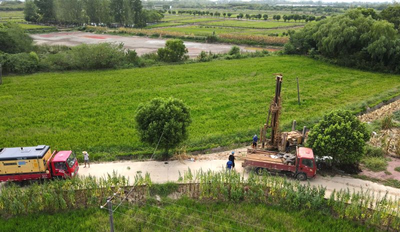 8月24日,施工人員在肥西縣花崗鎮(zhèn)為種糧大戶打水井(無人機(jī)照片)。