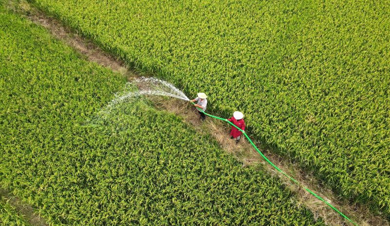 8月24日,肥西縣花崗鎮(zhèn)八里社區(qū)種糧大戶張守勤(左)利用剛打的水井灌溉水稻(無人機(jī)照片)。
