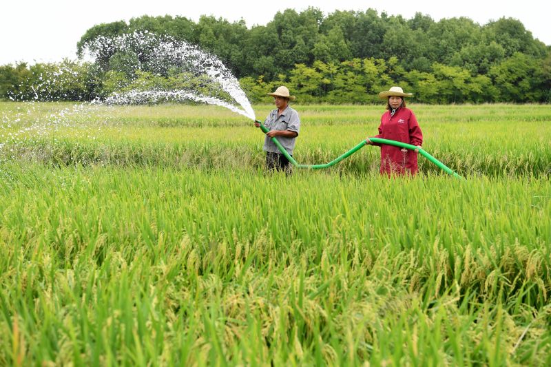 8月24日,肥西縣花崗鎮(zhèn)八里社區(qū)種糧大戶張守勤(左)利用剛打的水井灌溉水稻。