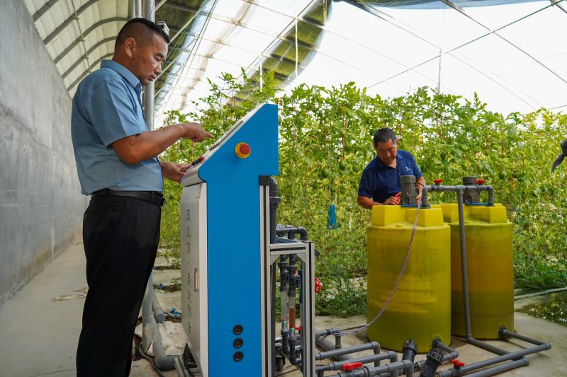 8月17日,技術(shù)人員在調(diào)試水肥滴灌設(shè)備。新華社記者朱崢攝