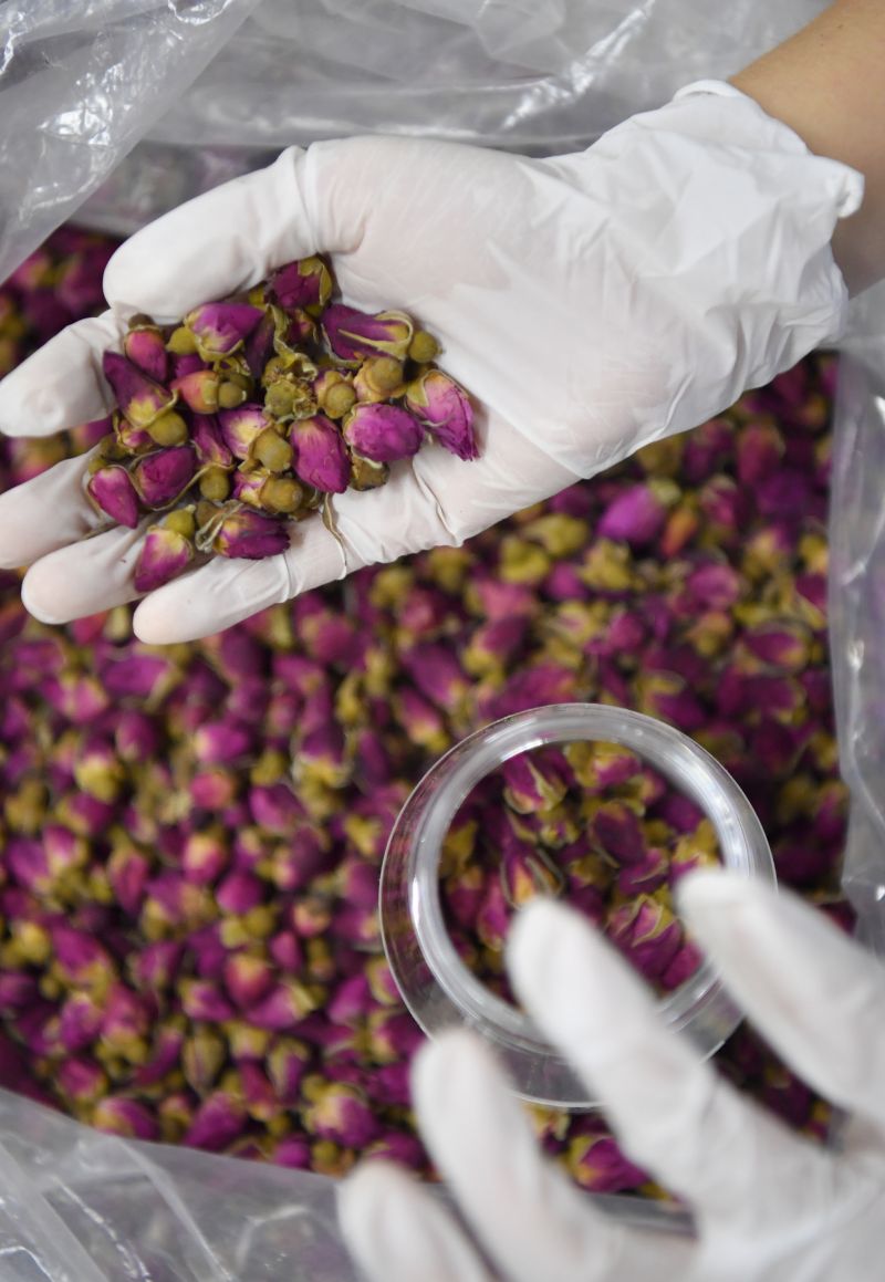 8月9日,陜西省漢陰縣一家食品加工企業(yè)的工人在挑揀玫瑰花茶。