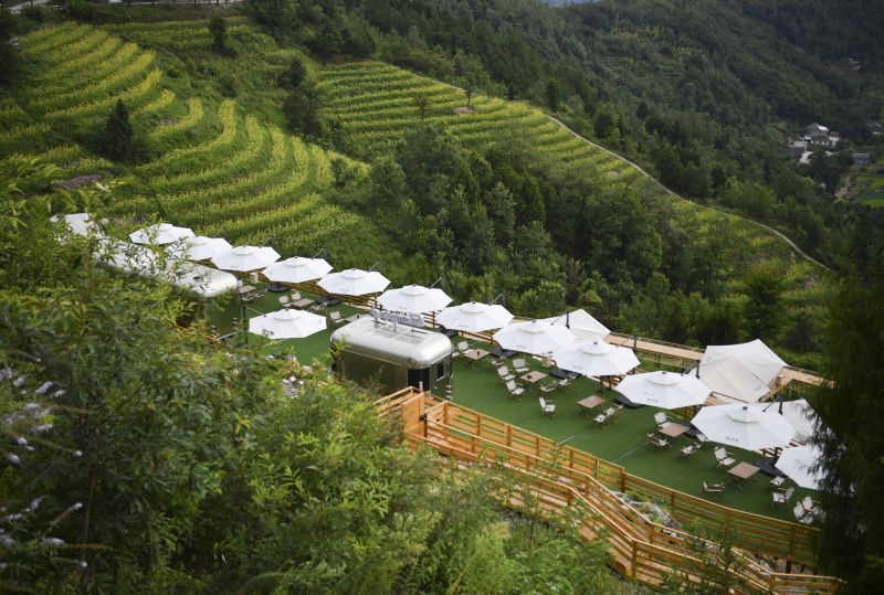 這是一處在陜西省漢陰縣漩渦鎮(zhèn)鳳堰古梯田邊開(kāi)發(fā)的露營(yíng)營(yíng)地(8月9日攝)。