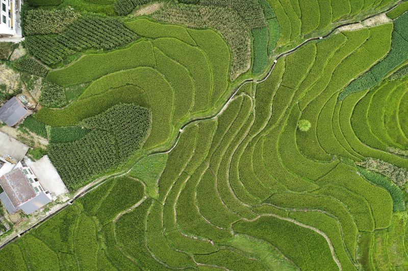這是8月9日拍攝的陜西省漢陰縣漩渦鎮(zhèn)鳳堰古梯田一景(無(wú)人機(jī)照片)。