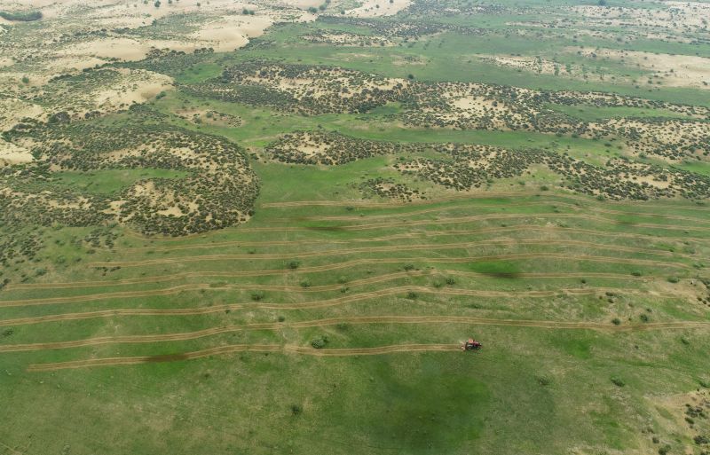 7月26日,治沙機械在鄂托克前旗百萬畝檸條種植項目區(qū)播種檸條(無人機照片)。