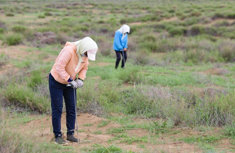 7月26日,治沙人員在鄂托克前旗百萬畝檸條種植項目區(qū)行走。