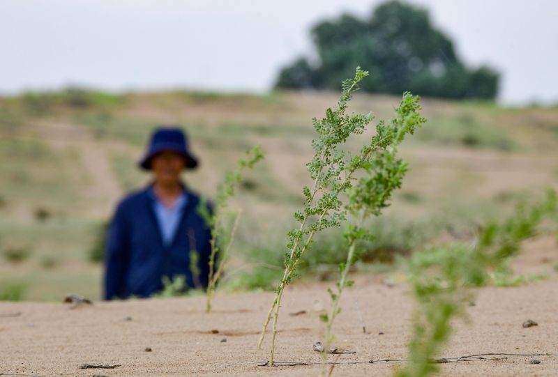 7月26日在鄂托克前旗百萬畝檸條種植項目區(qū)拍攝的檸條幼苗。