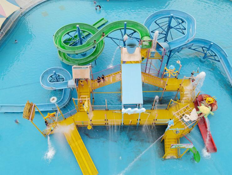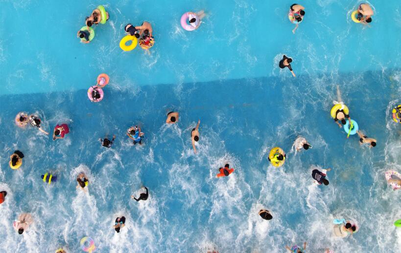 7月12日,在江蘇省揚(yáng)州市水上樂園,游客在戲水納涼(無人機(jī)照片)。 新華社發(fā)(孟德龍攝)