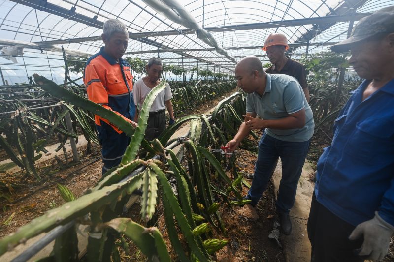 9月15日,在道場鄉(xiāng)紅里山村卉弘生態(tài)園的火龍果大棚內(nèi),生態(tài)園負(fù)責(zé)人鄭云宇(中)作為道場鄉(xiāng)黨員先鋒創(chuàng)業(yè)戶,為村民提供火龍果種植技術(shù)指導(dǎo)。新華社記者 徐昱 攝