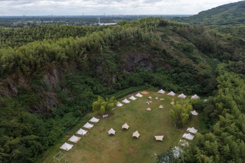 9月15日拍攝的道場鄉(xiāng)一處礦坑露營地(無人機(jī)照片)。該露營地在今年9月份正式開業(yè),是廢棄礦坑經(jīng)過改建而成的鄉(xiāng)村特色旅游景點(diǎn)。新華社記者 徐昱 攝