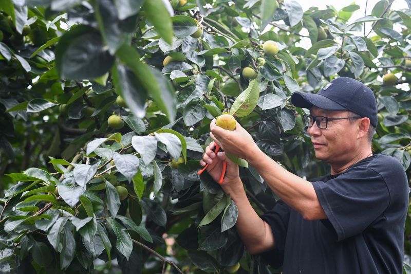 9月15日,在道場鄉(xiāng)的土蛋哥家庭農(nóng)場的柿子林內(nèi),黨員致富帶頭人周海衛(wèi)在采摘柿子。土蛋哥家庭農(nóng)場由周海衛(wèi)開辦,吸納了20多名周邊村民就業(yè)。新華社記者 徐昱 攝