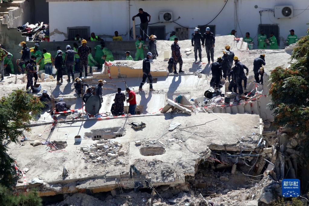 9月15日,救援人員在約旦首都安曼的居民樓倒塌事故現(xiàn)場(chǎng)工作。