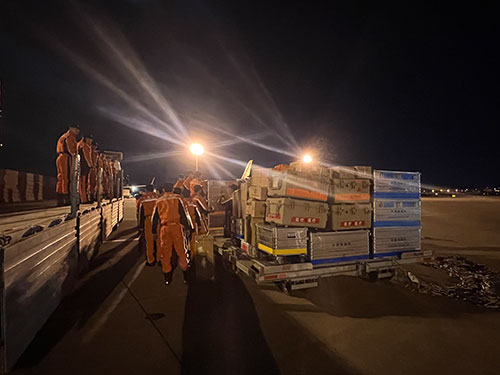 當(dāng)?shù)貢r(shí)間2月8日凌晨4點(diǎn)30分(北京時(shí)間9時(shí)30分),中國(guó)救援隊(duì)一行82人經(jīng)過(guò)約10小時(shí)的飛行,抵達(dá)土耳其阿達(dá)納機(jī)場(chǎng)。隊(duì)長(zhǎng)趙明介紹,根據(jù)當(dāng)?shù)貙?shí)際情況,中國(guó)救援隊(duì)立即開(kāi)展卸貨轉(zhuǎn)運(yùn)工作,盡快做好與我駐土耳其使館、當(dāng)?shù)卣⒙?lián)合國(guó)有關(guān)機(jī)構(gòu)對(duì)接,結(jié)合目前救援進(jìn)展情況,接領(lǐng)具體搜救行動(dòng)任務(wù),并擬派出救援小隊(duì)對(duì)執(zhí)行任務(wù)場(chǎng)地進(jìn)行實(shí)地勘查,同時(shí)選擇安全合適的位置搭建營(yíng)地。